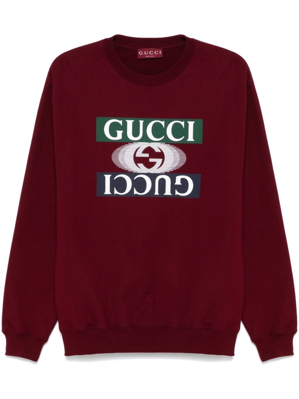 printed cotton sweatshirt Highlights - Wine red/fern green/white - Cotton - Jersey texture - Logo print to the front - Crew neck - Drop shoulder - Long sleeves - Ribbed trim - Signature interlocking g logo - French terry lining - Straight hem Made In Italy Composition Cotton 100% SIZE & FIT Model measurements Height 6 ft 1 in(1.85 m) Bust/Chest 35.82 in(91 cm) Hips 37.79 in(96 cm) Waist 29.13 in(74 cm) Measurement CHEST 46.45 in(118 cm) SLEEVE LENGTH 35.03 in(89 cm) Shoulder Width 21.25 in(54 cm) FittingInformation Designed for a regular fit, offering a comfortable loose fit throughout the body Made from a midweight non-stretch fabric, this piece offers minimal elasticity when worn