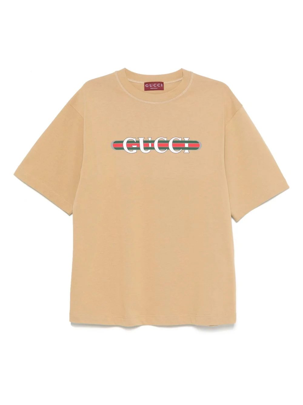 printed cotton T-shirt Highlights - Light brown - Signature web-stripe trim - Crew neck - Short sleeves Made in Italy Composition Cotton 100% SIZE & FIT Model measurements Height 6 ft 2 in(1.87 m) Bust/Chest 38.18 in(97 cm) Hips 36.61 in(93 cm) Waist 29.13 in(74 cm) FittingInformation Designed to be unstructured, offering a loose fit throughout Made from a midweight non-stretch fabric, this piece offers minimal elasticity when worn Washing instructions Machine Wash