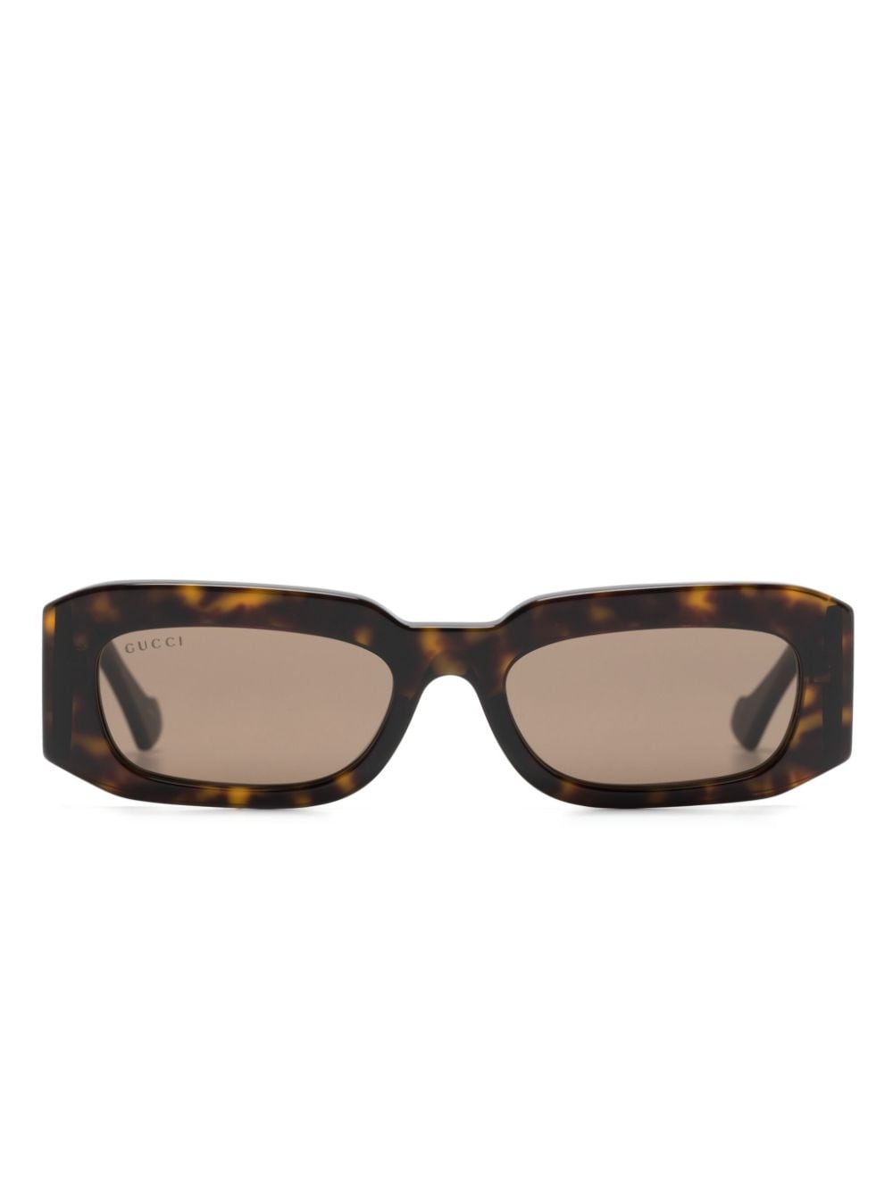 rectangle-frame sunglasses Infused with retro allure, these Gucci Eyewear sunglasses are characterised by their tortoiseshell finish. Shaped to a rectangular frame, they're finished with gold-tone logo lettering at the temples. Highlights - Havana brown - Acetate - Tortoiseshell effect - Lens decal - Logo print at the arm - Rectangle frame - Brown tinted lenses - Uv-protective lenses - Straight arms - Curved tips - These glasses come with a protective case. Made in Italy Composition Acetate 100% SIZE & FIT Measurement Arm Length 5.7 in(14.5 cm) Bridge Width 0.74 in(1.9 cm) Lens Diameter 2.12 in(5.4 cm) Total Width 5.51 in(14 cm)