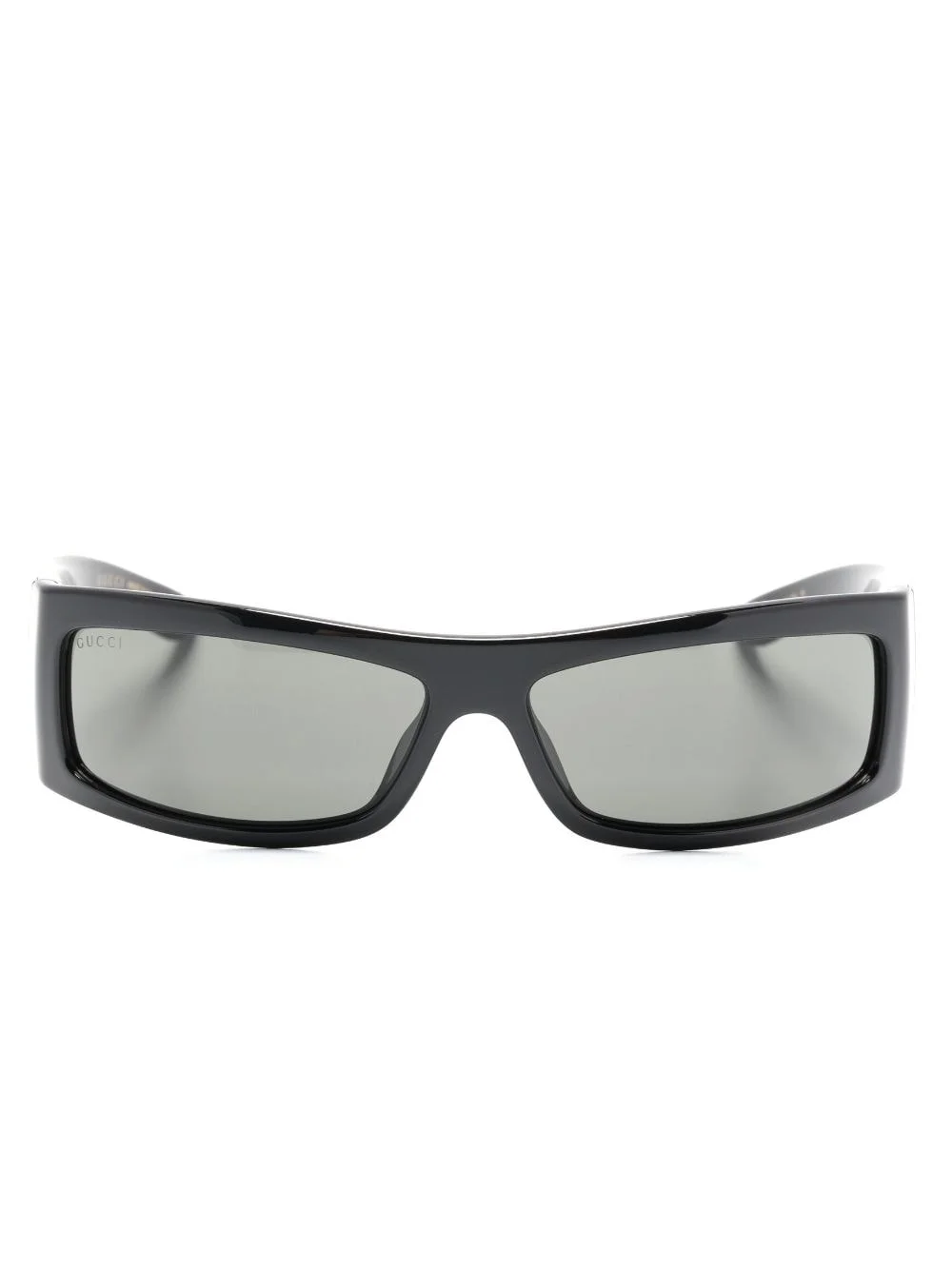 rectangular-frame sunglasses Rendered in black with grey tinted lenses, these rectangular framed sunglasses by Gucci are decorated with the house's logo script on the arm. Highlights - Black - Acetate - Grey tinted lenses - Rectangle frame - Logo print to the side - Curved tips - Uv protection - These glasses come with a protective case. Made in Italy Composition Acetate 100% SIZE & FIT Measurement Arm Length 5.11 in(13 cm) Bridge Width 0.55 in(1.4 cm) Lens Diameter 2.51 in(6.4 cm) Total Width 5.51 in(14 cm)