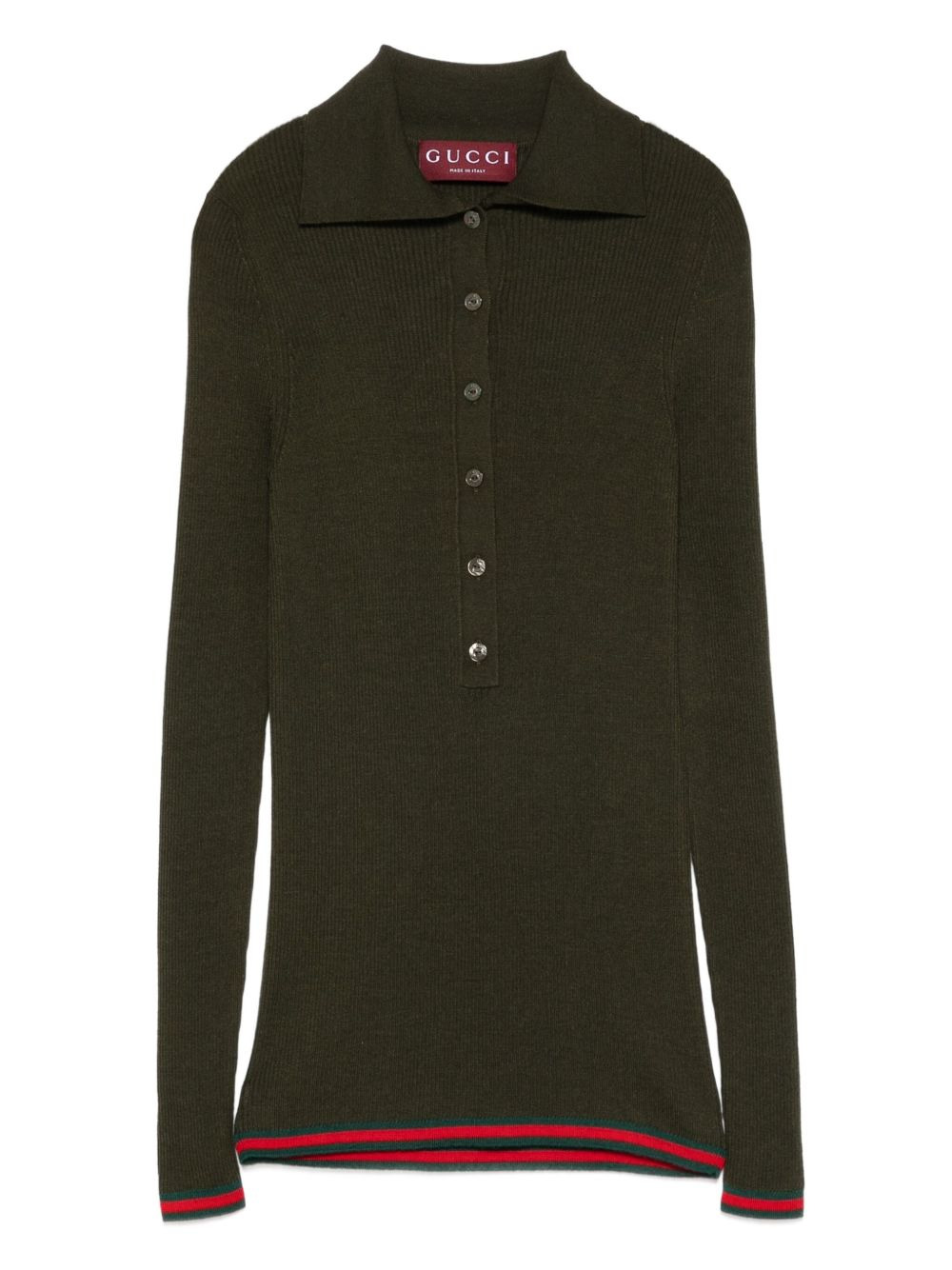 ribbed polo top Highlights - Dark green - Ribbed knit - Polo collar - Button placket - Long sleeves - Striped cuffs Made in Italy Composition Cashmere 70%, Silk 30% SIZE & FIT Model measurements Height 5 ft 10 in(1.77 m) Bust/Chest 32.28 in(82 cm) Hips 35.03 in(89 cm) Waist 25.19 in(64 cm) FittingInformation Designed for a slim fit that sits just away from the body offering a close yet comfortable fit Made with a midweight knit, this piece offers some stretch