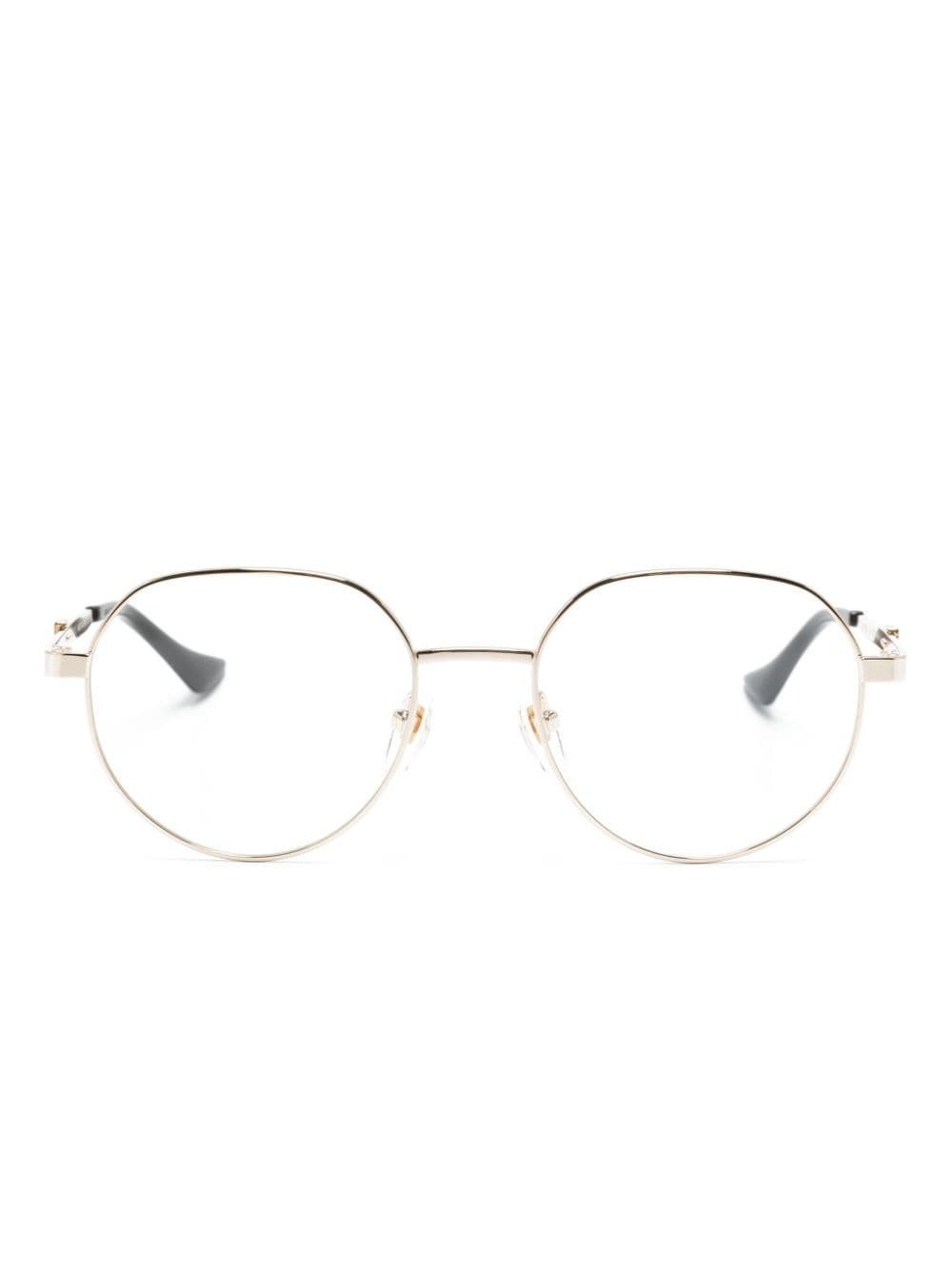 round-frame glasses Highlights - Gold-tone - Titanium/acetate - Round frame - Clear lenses - Nose pads - Logo-debossed arm - Signature web-stripe detailing at the arm - Straight arms with curved tips - These glasses come with a protective case. - All glasses from farfetch are sold as non-prescription frames. Made in Italy Composition Titanium 90%, Acetate 10% SIZE & FIT Measurement Arm Length 5.7 in(14.5 cm) Bridge Width 0.74 in(1.9 cm) Lens Diameter 2.04 in(5.2 cm) Total Width 5.31 in(13.5 cm)