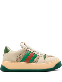 Screener leather sneakers Inspired by '70s sneaker silhouettes, Gucci's Screener sneakers feature the brand's vintage logo at the tongue, alongside a Double G plaque at the front, reiterating the heritage feel. For a truly heritage-filled silhouette, panels made out of the iconic GG canvas appear at the sides and toe. Highlights - Beige/green/multicolour - Leather - Panelled design - Classic gg canvas - Signature web detailing - Signature double g logo - Logo patch at the tongue - Contrasting branded heel counter - Round toe - Front lace-up fastening - Branded footbed - Flatform sole - This piece comes complete with a protective dust bag. Made in Italy Composition Sole: Rubber 100% Outer: Canvas 100%, Calf Leather 100% Lining: Calf Leather 100% SIZE & FIT Measurement HEEL 1.77 in(4.5 cm) Sole height 1.37 in(3.5 cm)
