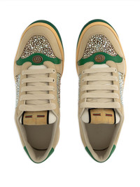 Screener sneakers Highlights - Beige - Contrasting green accents - Rhinestone embellishment - Lace-up closure - Round toe - Rubber outsole - Logo detail - Women's gucci sneakers fit large. for the most comfortable fit please select half a size down. Made in Italy Composition Sole: Rubber 100% Outer: Canvas 100%, Calf Leather 100% Lining: Calf Leather 100%