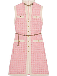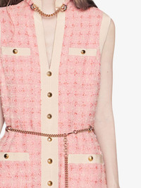 Short tweed dress with chain belt Imbued with an inherent ladylike feel, tweed defines a wide range of styles for Cruise 2019, from traditional shapes through unexpected, contemporary designs. Underlined by a contrast white trim, this short dress sports a classic silhouette, refined by ornamental vintage buttons. The detachable chain belt features tiger heads enriched with crystals and colored enamel, recalling a vintage brooch by Hattie Carnegie—a legendary jewelry and fashion designer in the 1920's-1950's. Pastel pink tweed with white trim. Ornamental gold-toned metal vintage buttons. Enameled tiger head collar chain and detachable belt with crystals—inspired by a vintage Hattie Carnegie jewelry design. Lined. Swan neck. Sleeveless. Patch pockets. Front slit. Back zip closure. Made in Italy. Made in Italy Composition Outer: Cotton 64%, Polyester 15%, Polyamide 8%, Viscose 6%, Linen/Flax 6%, Acrylic 1%