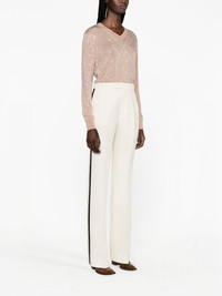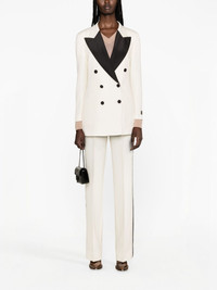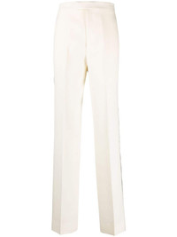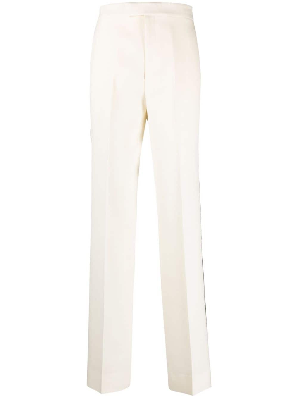 side-stripe wool trousers Gucci demonstrates its tailoring prowess with these white wool trousers. They’re cut to a high-waist straight-leg silhouette and contrasted with black satin side stripes. Highlights - White/black - Wool - Side stripe detailing - Pressed crease - High waist - Concealed front fastening - Two side slit pockets - Two rear button-fastening jetted pockets - Straight leg Made in Italy Composition Outer: Wool 100%, Silk 100% Lining: Acetate 75%, Silk 25% SIZE & FIT Model measurements Height 5 ft 11 in(1.8 m) Bust/Chest 34.25 in(87 cm) Hips 35.82 in(91 cm) Waist 24.8 in(63 cm) FittingInformation Designed for a straight-leg fit, these trousers allow for a close fit at the waist and an unrestricted, comfortable fit over the leg Made from a midweight non-stretch fabric This piece fits true to size – take your usual size