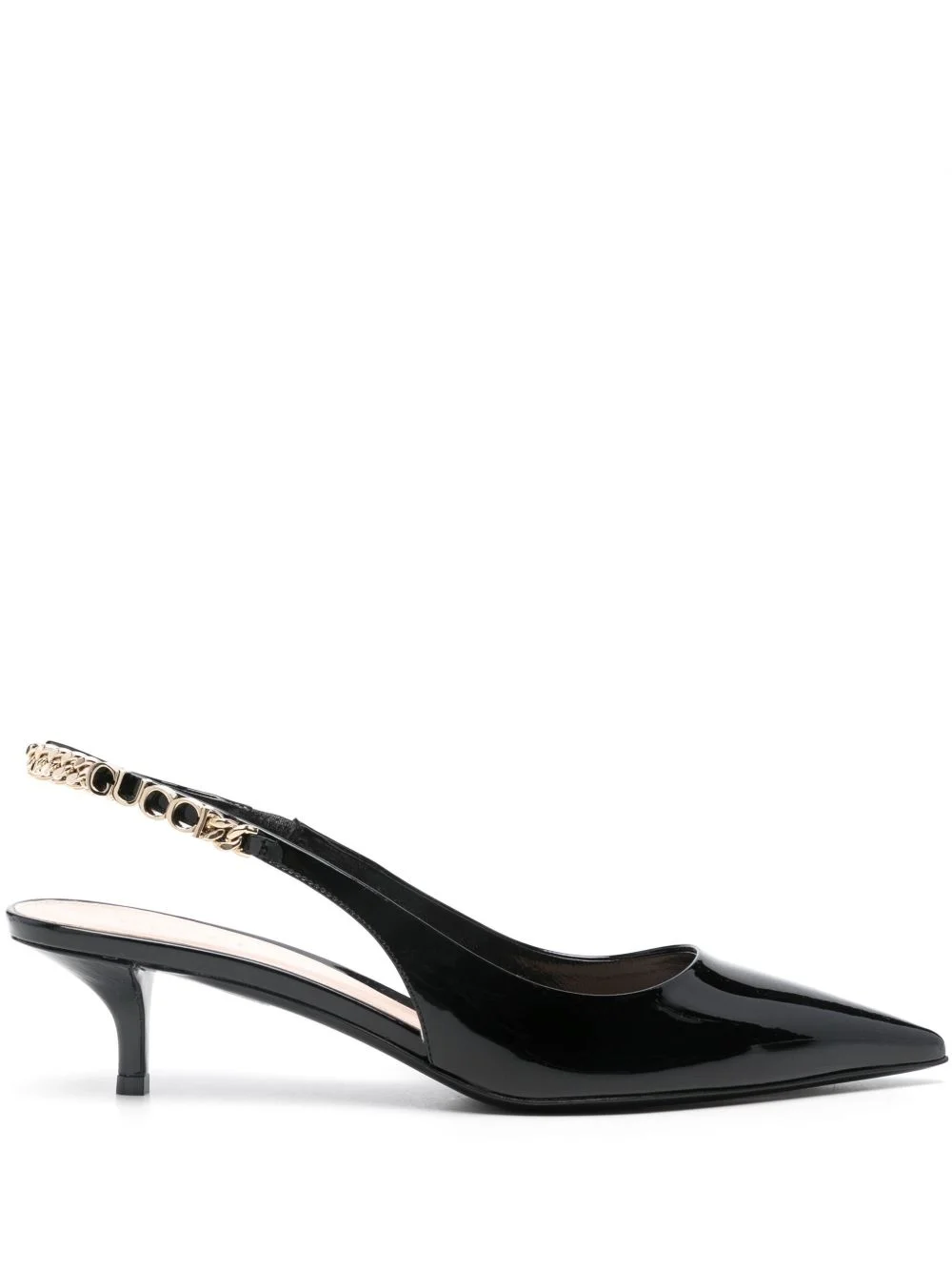 Signoria 45mm slingback pumps Highlights - Black - Calf leather - Patent finish - Elasticated slingback strap - 45mm kitten heel - Gold-tone logo plaque - Chain-link detailing - Pointed toe - Branded leather insole - Leather sole Made in Italy Composition Sole: Calf Leather 100% Lining: Calf Leather 100% Outer: Patent Calf Leather 100% SIZE & FIT Measurement HEEL 1.96 in(5 cm)