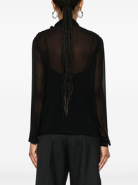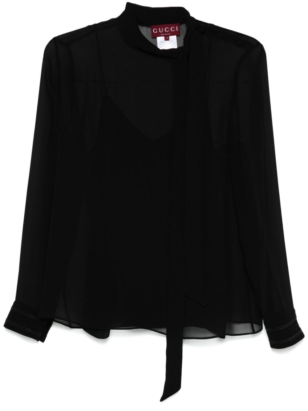 silk blouse Highlights - Black - Silk - Georgette crepe - Button fastening at the shoulder - High neck - Tie detail - Drop shoulder - Long sleeves - Buttoned cuffs - Embroidered logo at the sleeve - Detachable camisole - Curved hem Made in Italy Composition Outer: Silk 100% Lining: Acetate 75%, Silk 25% SIZE & FIT Model measurements Height 5 ft 11 in(1.8 m) Bust/Chest 32.28 in(82 cm) Hips 35.03 in(89 cm) Waist 24.8 in(63 cm) FittingInformation Designed for a relaxed fit, this piece allows for comfort and movement when worn The detachable slip sits just away from the body, offering a close yet comfortable fit Made from a lightweight non-stretch fabric