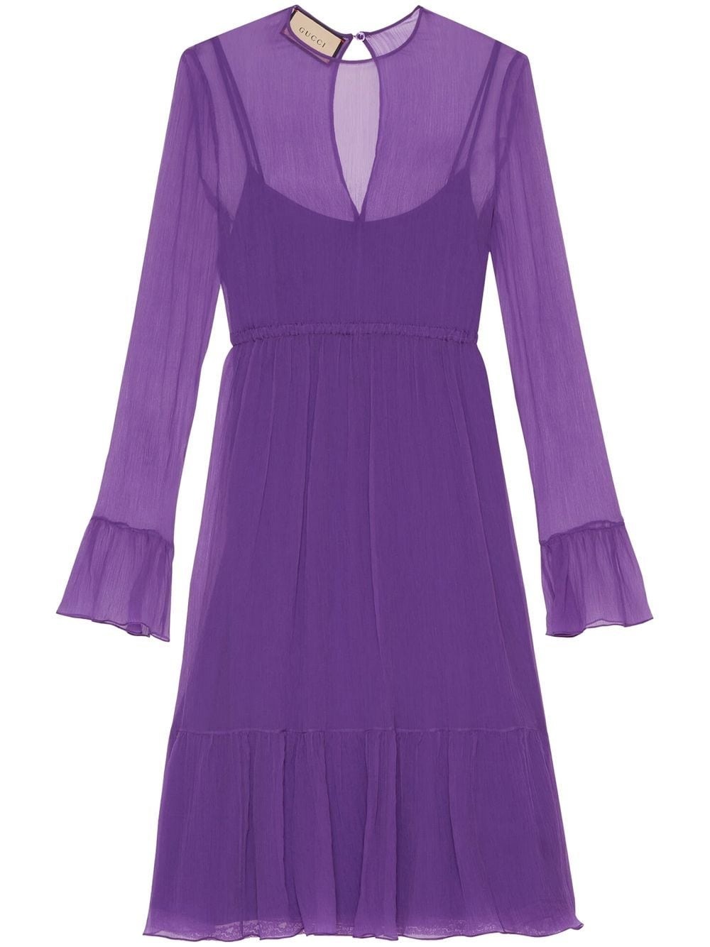 silk chiffon midi dress purple silk chiffon crepe internal slip dress keyhole detail to the rear flounce sleeves peplum hem elasticated waistband round neck long sleeves straight hem below-knee length Made in Italy Composition Silk 100%, Polyamide 100%