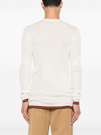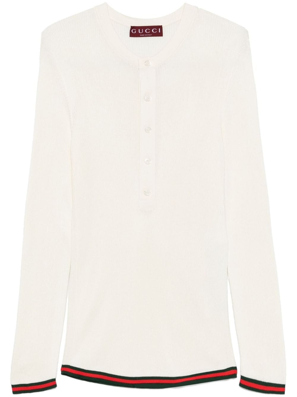silk ribbed top Highlights - White/forest green/scarlet - Silk - Ribbed knit - Short front button fastening - Signature web-stripe trim - Crew neck - Long sleeves - Straight hem Made in Italy Composition Silk 100% SIZE & FIT Model measurements Height 6 ft 1 in(1.85 m) Bust/Chest 35.82 in(91 cm) Hips 37.79 in(96 cm) Waist 29.13 in(74 cm) Measurement CHEST 28.34 in(72 cm) SLEEVE LENGTH 33.85 in(86 cm) LENGTH 26.77 in(68 cm) Shoulder Width 12.59 in(32 cm) FittingInformation Designed for a slim fit, offering a comfortable fit that sits just away from the body Made with a fine knit, this piece offers some stretch Washing instructions Dry Clean Only