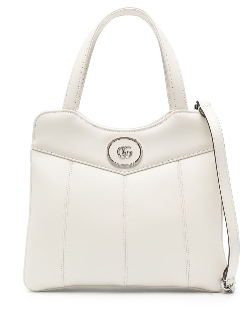 small Petite GG tote bag Highlights - Cream white - Leather - Two flat top handles - Detachable leather and chain-link shoulder strap - Signature double g logo - Main compartment - Internal zip-fastening pocket - Debossed internal logo - Suede lining - Silver-tone hardware - Top zip fastening - This piece comes complete with a protective dust bag. Made in Italy Composition Leather 100% SIZE & FIT Model measurements Height 5 ft 11 in(1.8 m) Bust/Chest 32.67 in(83 cm) Hips 36.22 in(92 cm) Waist 24.4 in(62 cm) Measurement DEPTH 3.14 in(8 cm) HANDLE 6.69 in(17 cm) HEIGHT 9.05 in(23 cm) STRAP 19.68 in(50 cm)