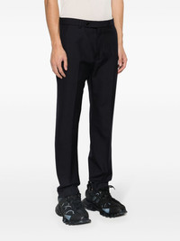 mid-rise tailored twill trousers Highlights - Navy blue - Twill weave - Logo patch to the rear - Pressed crease - Mid-rise - Belt loops - Concealed fly and button fastening - Two side slash pockets - Two rear button-fastening jetted pockets - Tailored cut - Straight leg Made in Italy Composition Outer: Polyester 55%, Wool 45% Lining: Cotton 100% SIZE & FIT Model measurements Height 6 ft 1 in(1.86 m) Bust/Chest 36.61 in(93 cm) Hips 37 in(94 cm) Waist 28.74 in(73 cm) FittingInformation Designed for a slim fit, offering a comfortable fit that sits just away from the leg Made from a midweight non-stretch fabric This piece fits true to size – take your usual size Washing instructions Dry Clean Only
