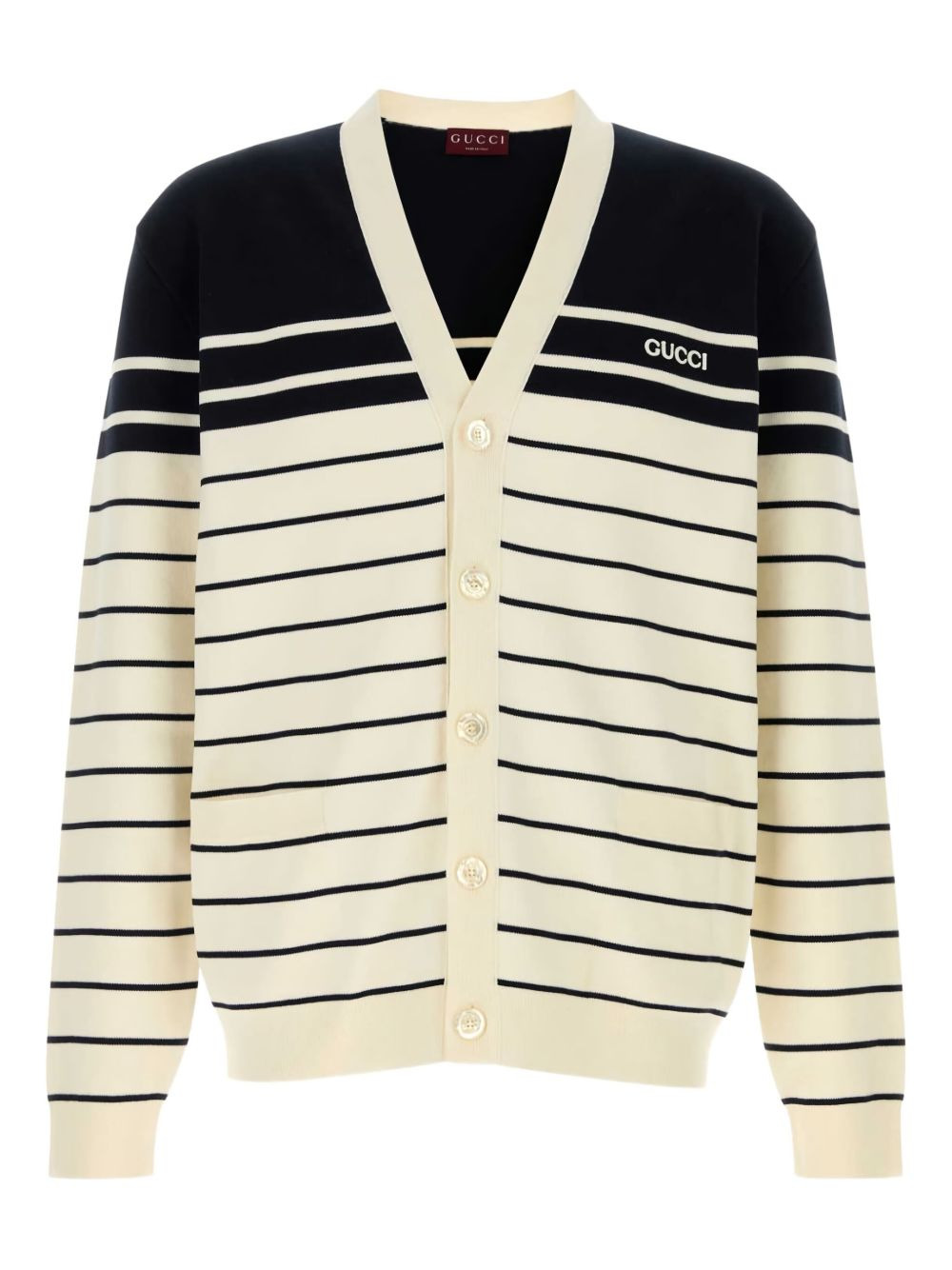 striped cotton cardigan Highlights - Off-white - Navy blue stripes - Button fastening - V-neck - Embroidered logo - Patch pockets Made in Italy Composition Cotton 100% Washing instructions Read Manufacturer Guidelines