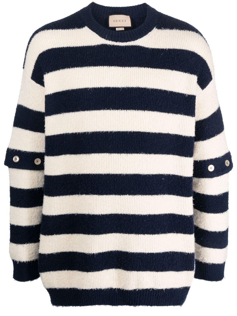 striped crew-neck brushed jumper Gucci's expert craftsmanship and use of only the finest materials is showcased in this cotton jumper. It features a brushed effect. Highlights - Beige/navy blue - Cotton - Horizontal stripe pattern - Knitted construction - Brushed effect - Crew neck - Drop shoulder - Long sleeves - Straight hem Made in Italy Composition Cotton 100%
