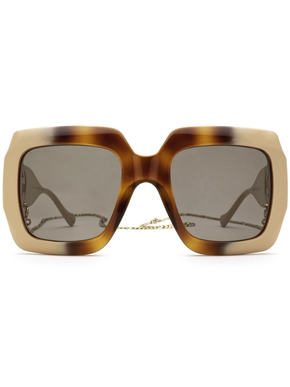 tortoiseshell-effect oversized-frame sunglasses Speaking to the brand's maximalist approach, these tortoiseshell-effect sunglasses from Gucci Eyewear feature an oversize frame. They're detailed with the house's Interlocking G logo at the arms, a signature motif that alludes to Guccio Gucci's initials. Highlights - Brown - Tortoiseshell effect - Gold-tone hardware - Logo plaque at the arm - Oversize frame - Straight arms - All glasses from farfetch are sold as non-prescription frames. Made in United States Composition Acetate 100% SIZE & FIT Measurement Arm Length 5.51 in(14 cm) Bridge Width 0.9 in(2.3 cm) Lens Diameter 2.12 in(5.4 cm)