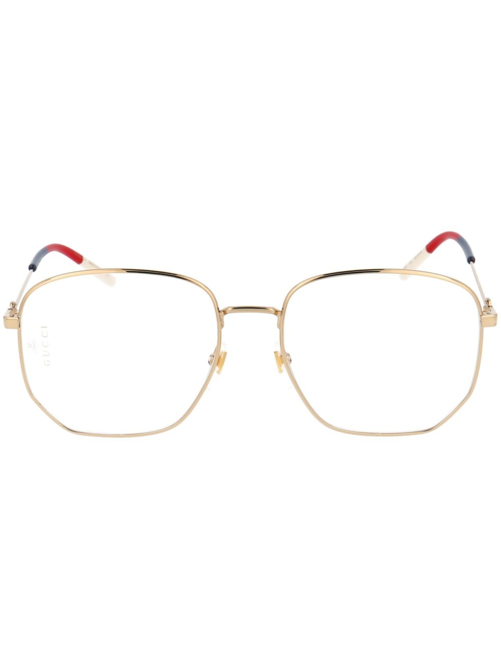 Web-detail hexagonal-frame glasses Highlights - Gold-tone - Acetate/metal - Signature web detailing - Hexagonal face - Clear lenses - Nose pads - Straight arms - Curved tips - These glasses come with a protective case. Made in Italy Composition Metal 80%, Acetate 20% SIZE & FIT Measurement Bridge Width 0.7 in(1.8 cm) Lens Diameter 2.2 in(5.6 cm) Total Width 5.51 in(14 cm) Arm Length 5.51 in(14 cm)