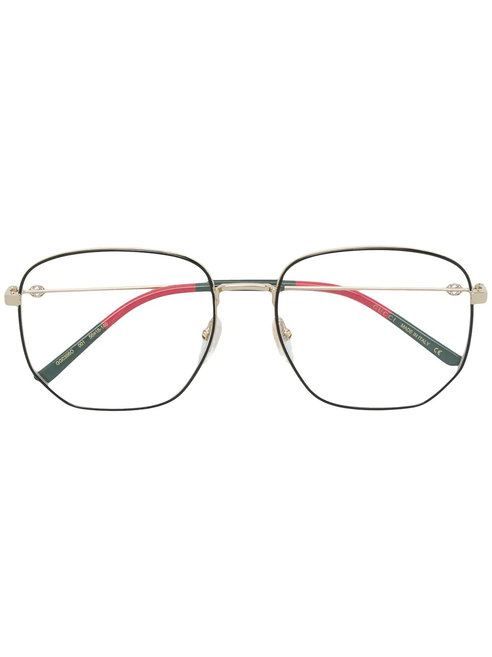Web detail hexagonal-frame glasses Remember how you used to think those high school geometry classes would do nothing for you? Designed with hexagonal frames and detailed with a signature green and red Web at the tips, these black and gold-tone glasses from Gucci Eyewear will give you a brand new perspective - literally. Guess teachers do know better after all... Featuring nose pads, an interlocking GG logo at the temple and straight arms with curved tips. This item comes with a protective case. Made in Italy Composition Metal (Other) 80%, Acetate 20% SIZE & FIT Measurement Bridge Width 0.7 in(1.8 cm) Lens Diameter 2.2 in(5.6 cm) Total Width 5.51 in(14 cm) Arm Length 5.51 in(14 cm)