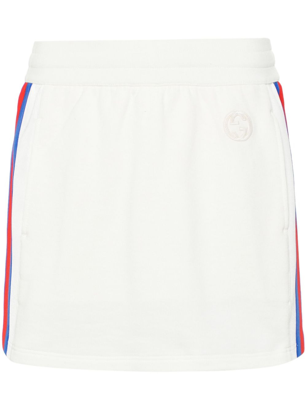 Web-Stripe cotton miniskirt Highlights - White/multicolour - Cotton - Jersey texture - Signature web-stripe trim - Signature interlocking g logo - Embroidered logo to the side - Elasticated waistband with internal drawstring - A-line - Two side slit pockets - Straight hem - Thigh-length - Partial lining Made in Italy Composition Lining: Cotton 100% Outer: Cotton 100%, Polyamide 100%, Polyester 96%, Spandex/Elastane 4% SIZE & FIT Model measurements Height 5 ft 10 in(1.77 m) Bust/Chest 32.28 in(82 cm) Hips 35.03 in(89 cm) Waist 25.19 in(64 cm) FittingInformation This mini-length skirt is intended to be worn just below the waist The elasticated waist allows for a comfortable fit Made from a midweight stretch fabric, this piece offers elasticity and flexibility when worn This piece fits true to size – take your usual size Washing instructions Hand Wash