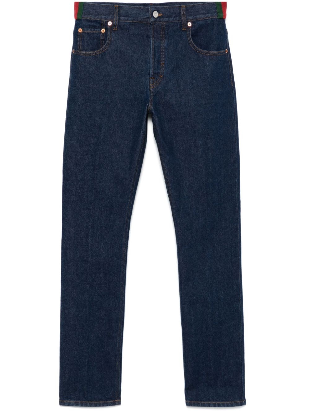 Web-stripe jeans Highlights - Indigo blue - Cotton - Denim - Signature web-stripe trim to the waistband - Concealed fly and button fastening - Contrast stitching - Belt loops - Classic five pockets - Rivet detailing - Logo patch to the rear - Full-length - Slim cut Made in Italy Composition Outer: Cotton 100%, Calf Leather 100%, Wool 88%, Polyester 12% Lining: Polyester 65%, Cotton 35% SIZE & FIT Model measurements Height 6 ft 1 in(1.85 m) Bust/Chest 35.82 in(91 cm) Hips 37.79 in(96 cm) Waist 29.13 in(74 cm) FittingInformation Designed for a slim fit, these jeans offer a comfortable fit that sits just away from the leg Sturdy and hard-wearing, this denim piece offers no stretch