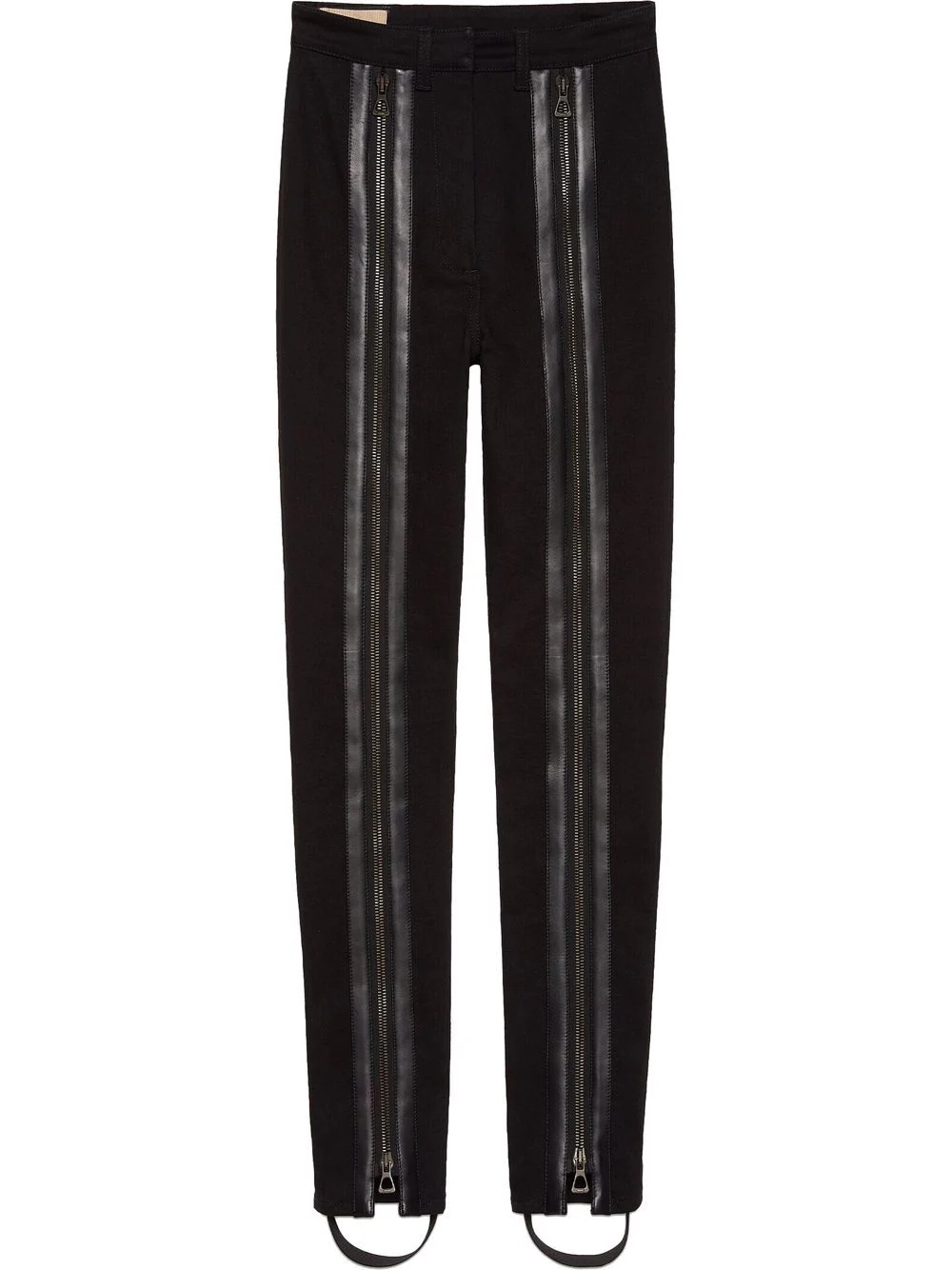 zip-detail stirrup trousers Gucci's trousers honour archival designs from the 1990s under the creative direction of Tom Ford. This all-black stirrup pair is accented with leather strips and zips running along the legs. Made in Italy Composition Cotton 100%