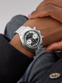 chronograph quartz 44mm Highlights - 44mm - Black - Stainless steel - Round face - Geometric dial - Baton hands - Chronograph counters - Date indication - Quartz movement - Chronograph pushers - Screw-down crown - Adjustable link bracelet - This item comes with a standard one-year warranty from the boutique. Imported Composition stainless steel 100% SIZE & FIT Measurement DIAMETER 1.73 in(4.4 cm)