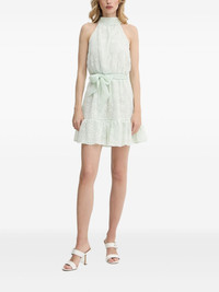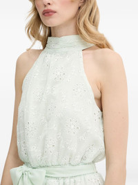 eyelet-embroidered halterneck mini dress Highlights - Light green - Eyelet embroidery - Halterneck - Self-tie belt - Ruffled hem Imported Composition Polyester 100% Washing instructions Read Manufacturer Guidelines