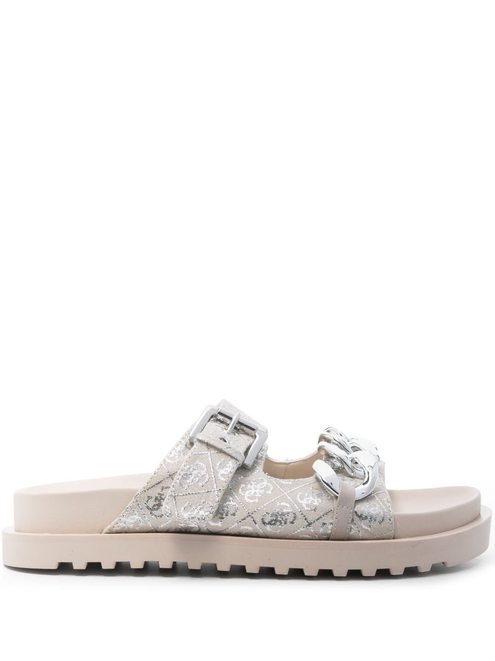 Fatema slides Highlights - Light beige - Buckle-strap fastening - Rubber lug sole - All-over logo print - Chain-link detailing Imported Composition Outer: Linen/Flax 40%, Cotton 30%, Polyester 30% Lining: Fabric 100% Sole: Rubber 100%