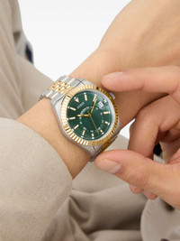 Jaden 42mm Highlights - 42mm - Green - Stainless steel - Round face - Geometric dial - Baton hands - Date indication - Quartz movement - Fluted bezel - Screw-down crown - Adjustable link bracelet - This item comes with a standard one-year warranty from the boutique. Imported Composition Recycled Steel 100%, Mineral Glass 100% SIZE & FIT Measurement DIAMETER 1.65 in(4.2 cm)