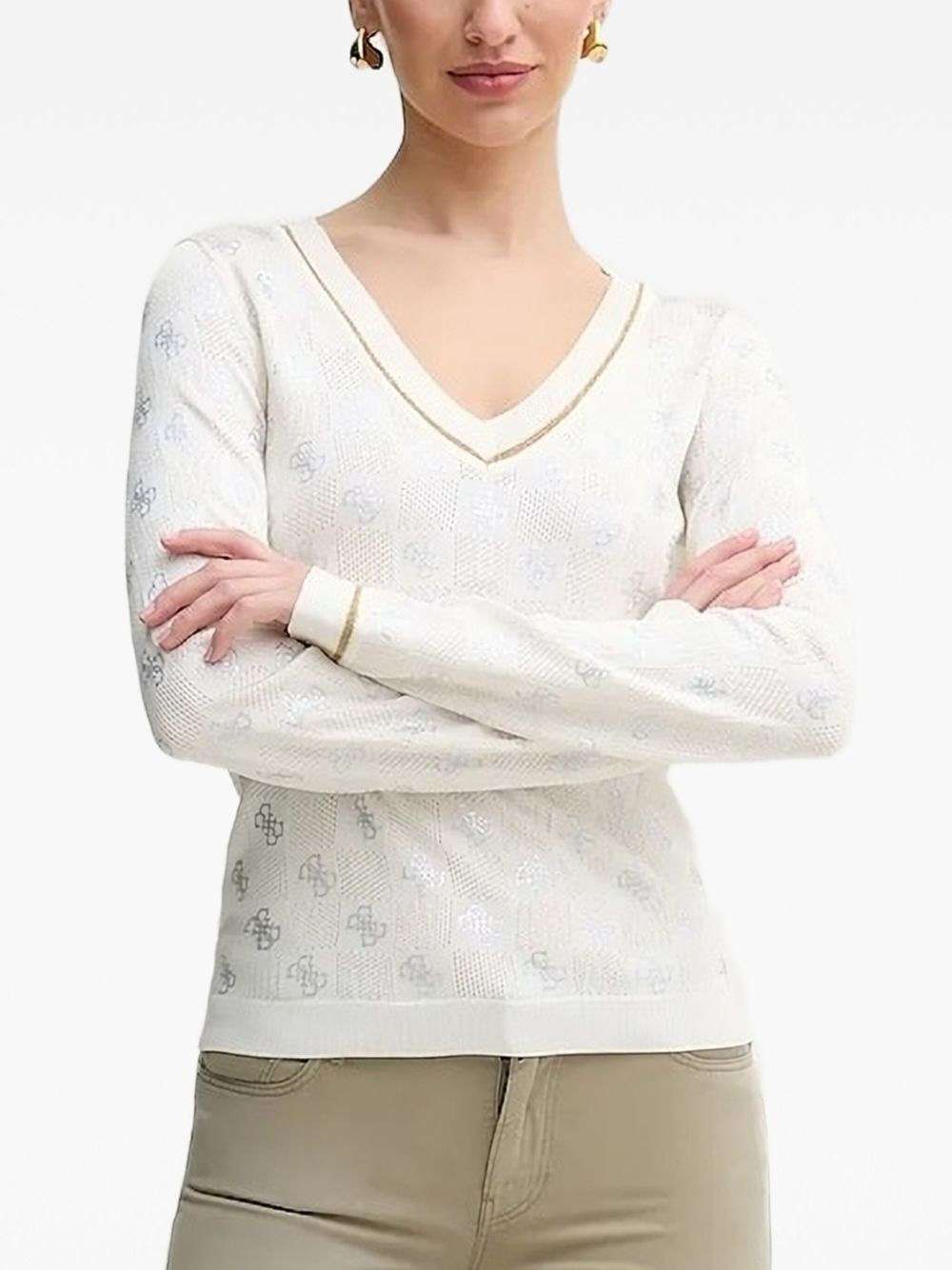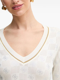 logo-pattern V-neck sweater Highlights - White - V-neck - Gold-tone trim - Logo pattern - Open knit - Long sleeves Imported Composition Viscose 78%, Polyamide 22% Washing instructions Read Manufacturer Guidelines