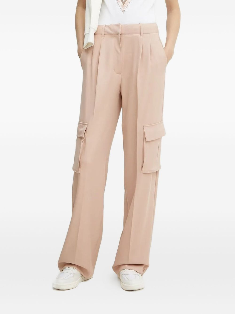 pleated cargo trousers Highlights - Light pink - Pleated front - Side cargo pockets - Belt loops Imported Composition Polyester 96%, Elastane 4% Washing instructions Read Manufacturer Guidelines