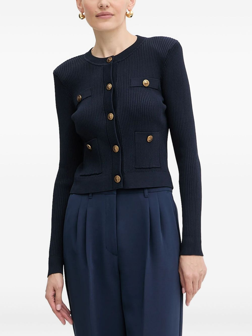 ribbed button-embellished cardigan Highlights - Navy blue - Ribbed knit - Gold-tone buttons - Patch pockets - Round neck - Long sleeves Imported Composition Viscose 63%, Polyamide 37% Washing instructions Read Manufacturer Guidelines