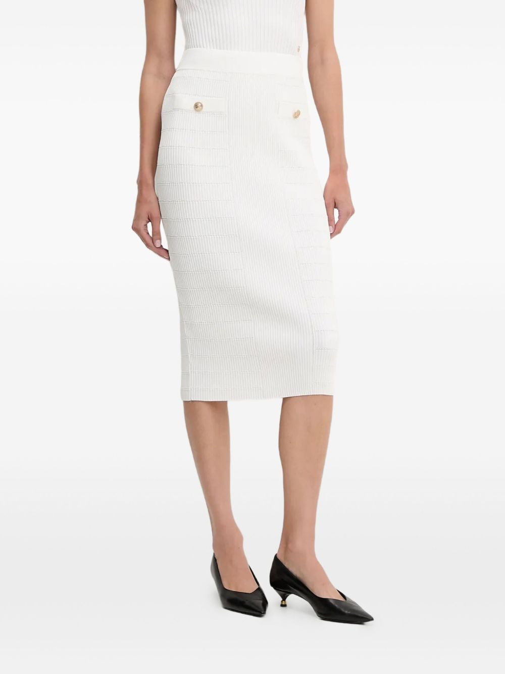 ribbed midi skirt Highlights - Off-white - Ribbed knit - Gold-tone buttons - Welt pockets - Straight hem - Close-fitting Imported Composition Viscose 70%, Polyamide 29%, Elastane 1% Washing instructions Read Manufacturer Guidelines