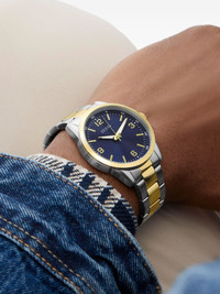 stainless steel 40mm Highlights - Dark blue dial - Round case shape - 40 case size - Baton markers - Gold-tone bezel - Quartz movement - Water resistance up to 50m/5 atm - This item comes with a standard one-year warranty from the boutique. Imported Composition Recycled Steel 100%, stainless steel 100% SIZE & FIT Measurement DIAMETER 1.57 in(4 cm)