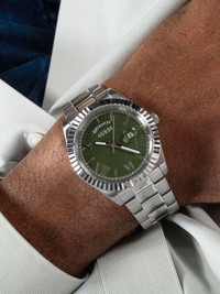 stainless steel quartz 42mm Highlights - 42mm - Forest green - Stainless steel - Round face - Roman numeral dial - Baton hands - Date indication - Quartz movement - Fluted bezel - Screw-down crown - Adjustable link bracelet - Folding clasp - This item comes with a standard one-year warranty from the boutique. Imported Composition stainless steel 100%, Mineral Glass 100% SIZE & FIT Measurement DIAMETER 1.65 in(4.2 cm)