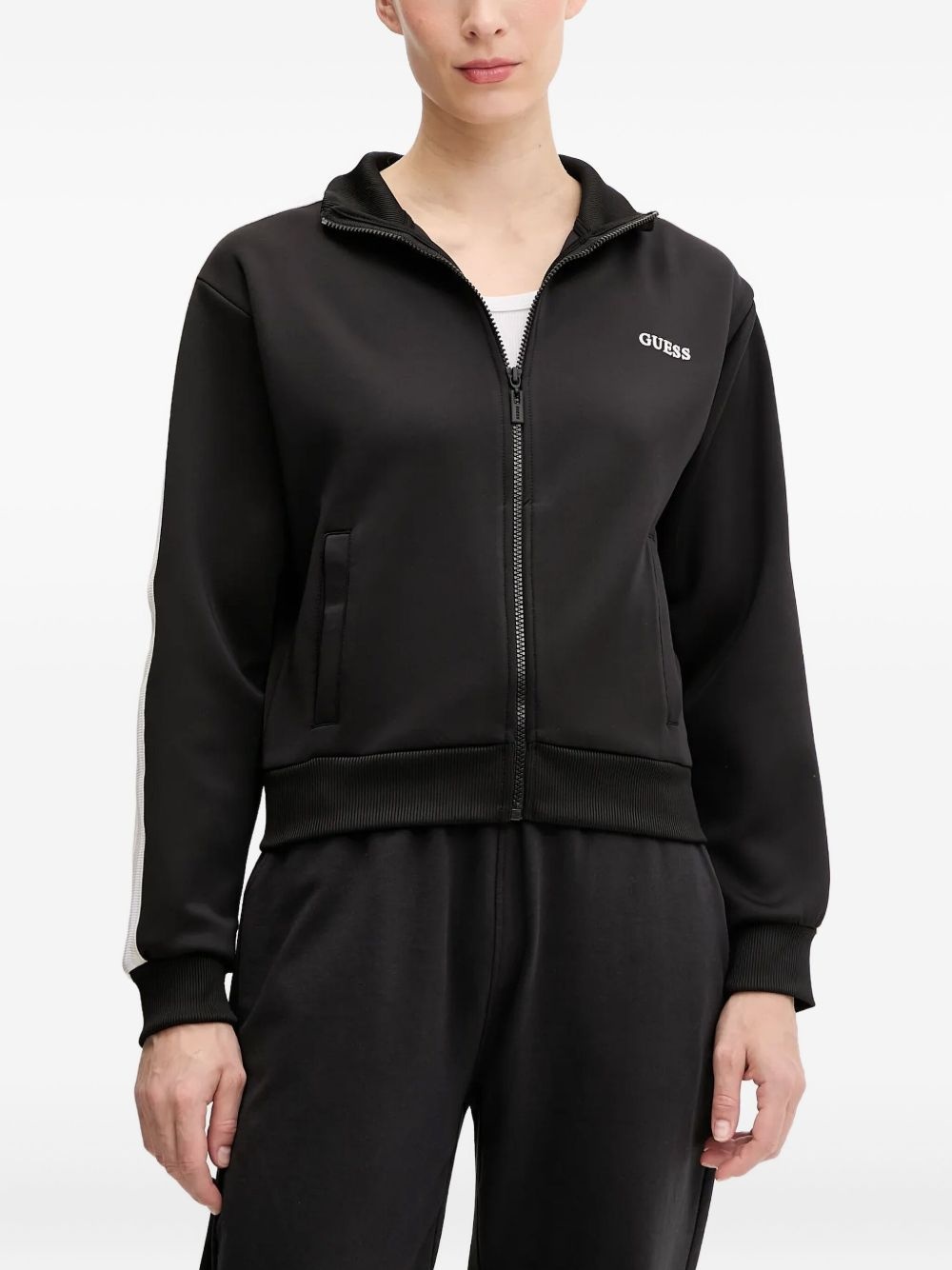 stripe-detail zip-up sweatshirt Highlights - Black - Zip fastening - Ribbed hem - Long sleeves - High neck - Side stripe detail Imported Composition Recycled Polyester 94%, Recycled Elastane 6% Washing instructions Read Manufacturer Guidelines