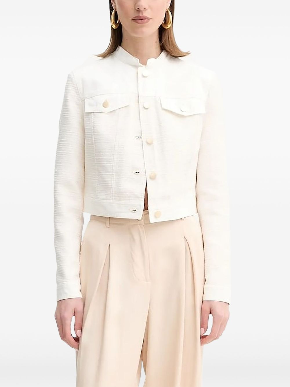 textured cropped jacket Highlights - Off-white - Textured weave - Button fastening - Cropped length - Flap pockets Imported Composition Cotton 60%, Polyester 38%, Polyamide 1%, Metallic Fibre 1% Washing instructions Read Manufacturer Guidelines