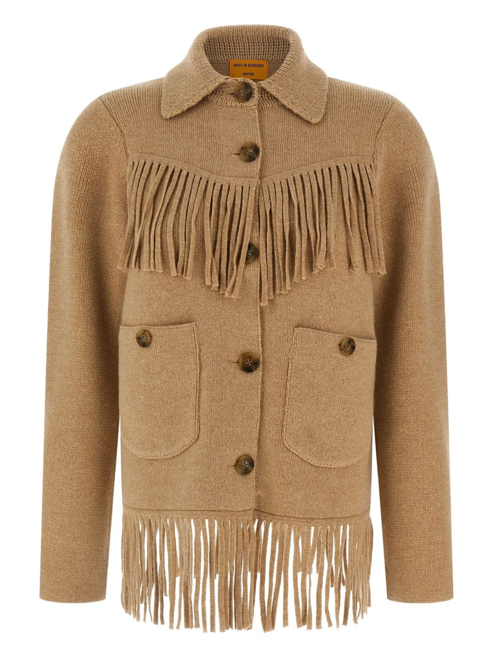 fringe-detailed wool cardigan Highlights - Beige - Wool material - Front button closure - Shirt collar - Elbow patches - Fringe detail Imported Composition Wool 70%, Cashmere 30% Washing instructions Read Manufacturer Guidelines