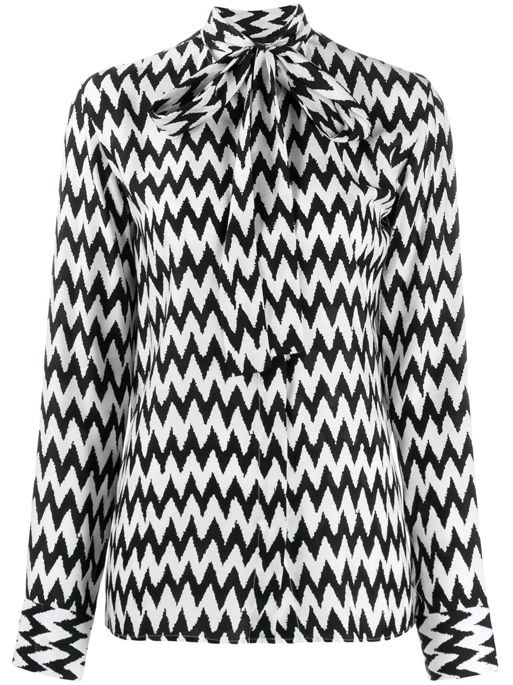 printed pussy bow blouse Black silk and cotton blouse from Haider Ackermann featuring a band collar with a pussy bow detail to the front, long sleeves, a two tone design, a front button placket and an all-over zig zag print. Imported Composition Cotton 100%, Rayon 70%, Silk 30% SIZE & FIT FittingInformation This piece fits true to size. We recommend you get your regular size Cut for a loose fit Made with a lightweight non-stretch fabric Washing instructions Dry Clean Only