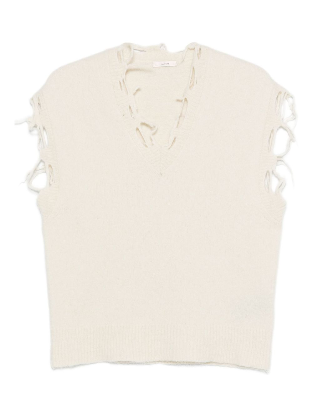 distressed-finish top Highlights - Ecru - Wool blend - V-neck - Sleeveless - Frayed edges - Cropped Made in Italy Composition Alpaca 49%, Recycled Nylon 30%, Merino 21% Washing instructions Hand Wash