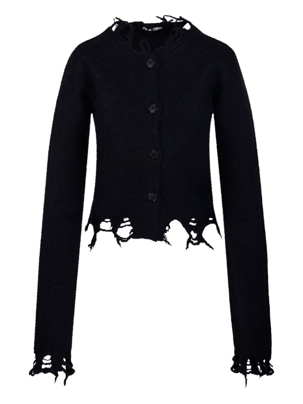 frayed-hem distressed cardigan Highlights - Black - Frayed hem and cuffs - Front button front - Long sleeves - Relaxed fit Made in Italy Composition Fabric 100% Washing instructions Read Manufacturer Guidelines
