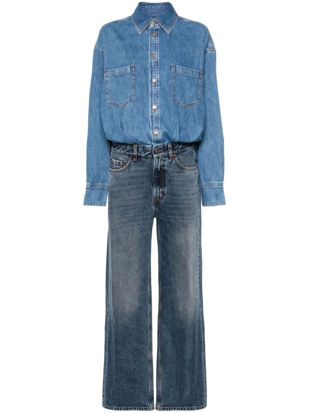 panelled-design denim jumpsuit Highlights - Blue - Cotton - Denim - Panelled design - Logo patch to the rear - Pointed flat collar - Long sleeves - Buttoned-cuff sleeves - Two chest patch pockets - Whiskering at the thighs - Belt loops at the waist - Classic five-pocket design - Straight leg - Front button and zip fastening Made in Italy Composition Cotton 100% SIZE & FIT Model measurements Height 5 ft 11 in(1.8 m) Bust/Chest 33.07 in(84 cm) Hips 37 in(94 cm) Waist 25.59 in(65 cm) FittingInformation Designed for a loose fit at the chest and waist with a close fit on the hips Sturdy and hard-wearing, this denim piece offers no stretch This piece fits true to size – take your usual size Measurement INSIDE LEG 30.98 in(78.7 cm) HIPS 40 in(101.6 cm) Hem Width 20 in(50.8 cm) WAIST 32 in(81.3 cm) Washing instructions Machine Wash