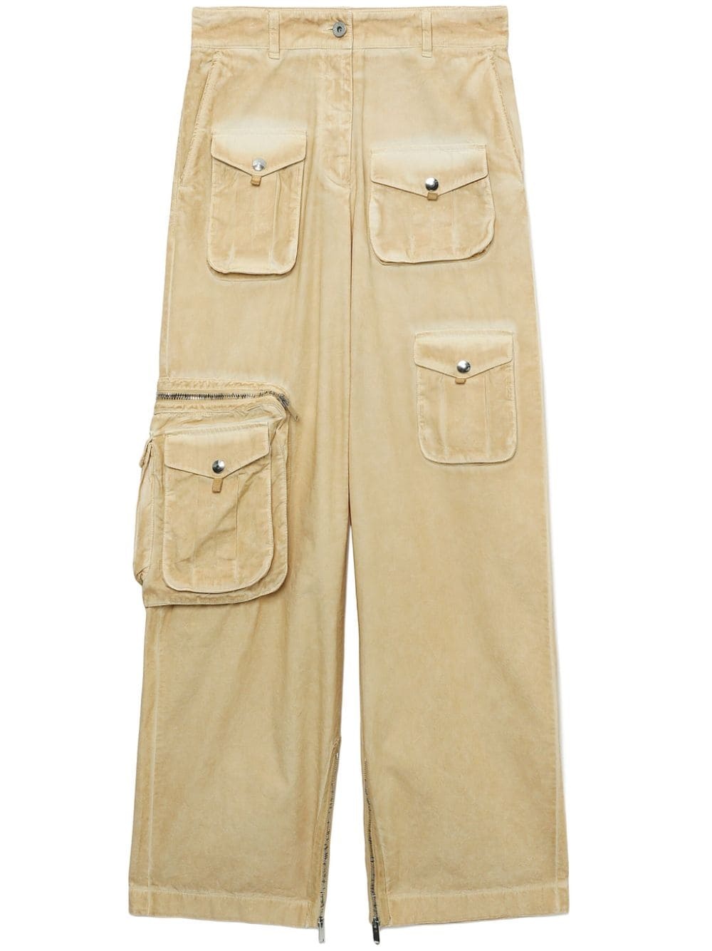 faded cotton cargo trousers Highlights - Beige - Cotton - Faded effect - Logo patch to the rear - Belt loops - Concealed fly and button fastening - Two side slash pockets - Multiple cargo pockets - Two rear welt pockets - Cuff zips - Wide leg Made in Italy Composition Cotton 100%