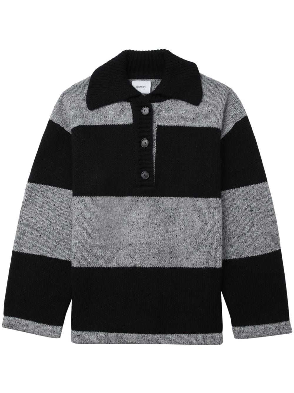 spread-collar striped jumper Highlights - Black/dark grey - Wool-cotton blend - Knitted construction - Horizontal stripe pattern - Spread collar - Front button placket - Long sleeves - Straight hem Made in Italy Composition Wool 77%, Cotton 23%