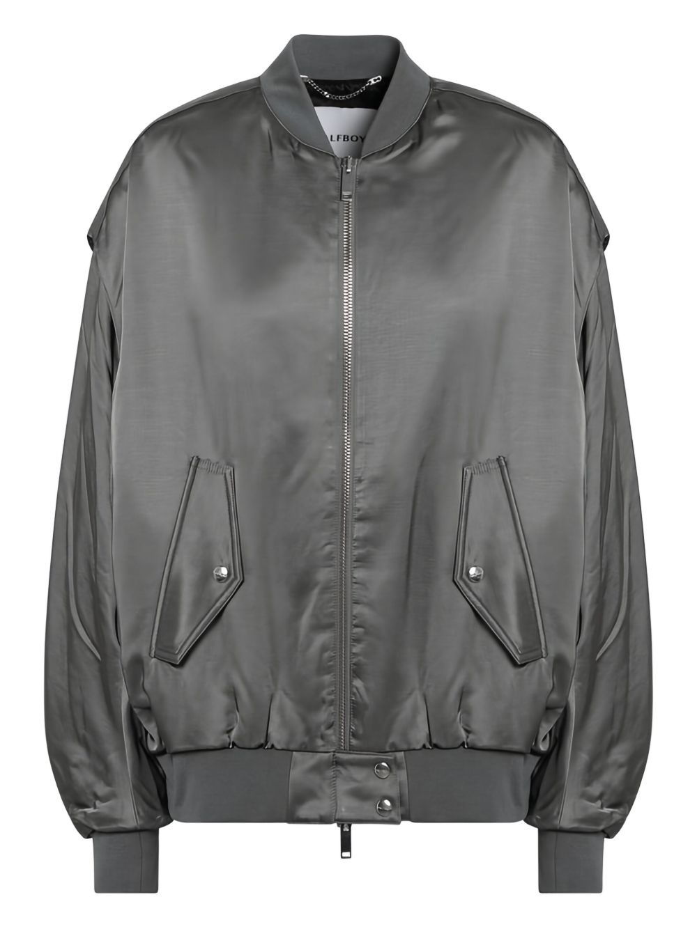 zip-up bomber jacket Highlights - Grey - Front button fastening - Two side flap pockets - Long sleeves Made in Italy Composition Outer: Viscose 100% Lining: Acetate 50%, Viscose 50% SIZE & FIT FittingInformation Designed for an oversized fit, offering additional room throughout The ribbed hem offers a close, comfortable fit Made from a padded non-stretch fabric, giving it no natural elasticity