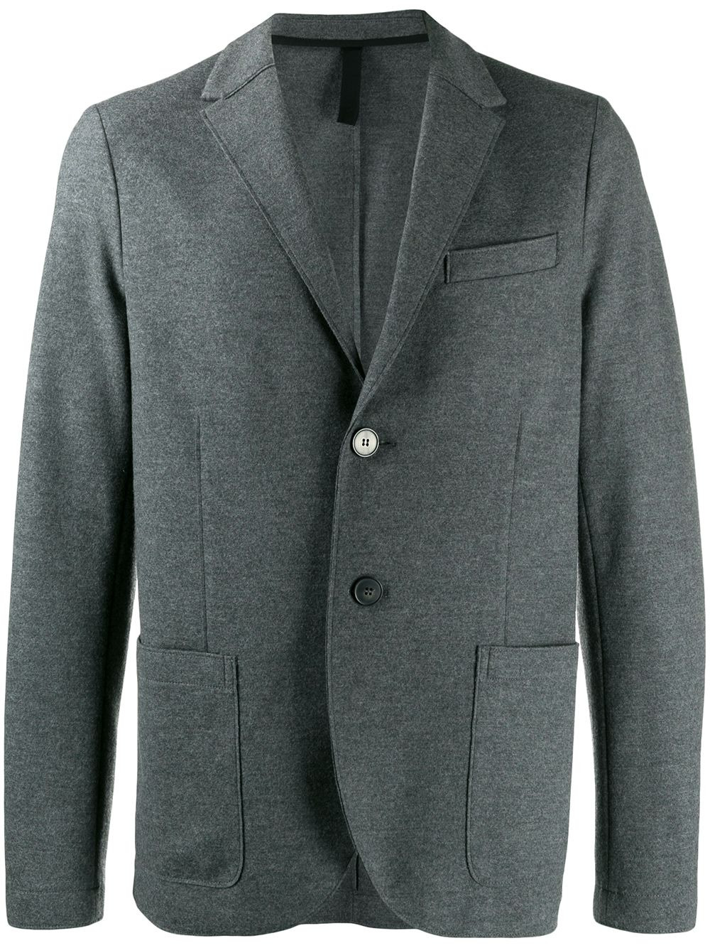 casual blazer Grey virgin wool casual blazer from Harris Wharf London featuring notched lapels, a front button fastening, long sleeves, a pocket square, front pockets and a straight hem. POSITIVELY CONSCIOUS: Harris Wharf London scores 3 out 5 by independent ethical brand rating agency Good On You. Its products are made to order and manufactures locally to reduce its carbon footprint. It does not use fur, leather, down, exotic animal skin or angora. Made in Italy Composition Virgin Wool 100% SIZE & FIT Model measurements Height 6 ft 2 in(1.87 m) Bust/Chest 37.79 in(96 cm) Hips 37.79 in(96 cm) Waist 30.31 in(77 cm) FittingInformation This piece fits true to size. We recommend you get your regular size Regular fit Made with a mid-weight fabric Washing instructions Dry Clean Only