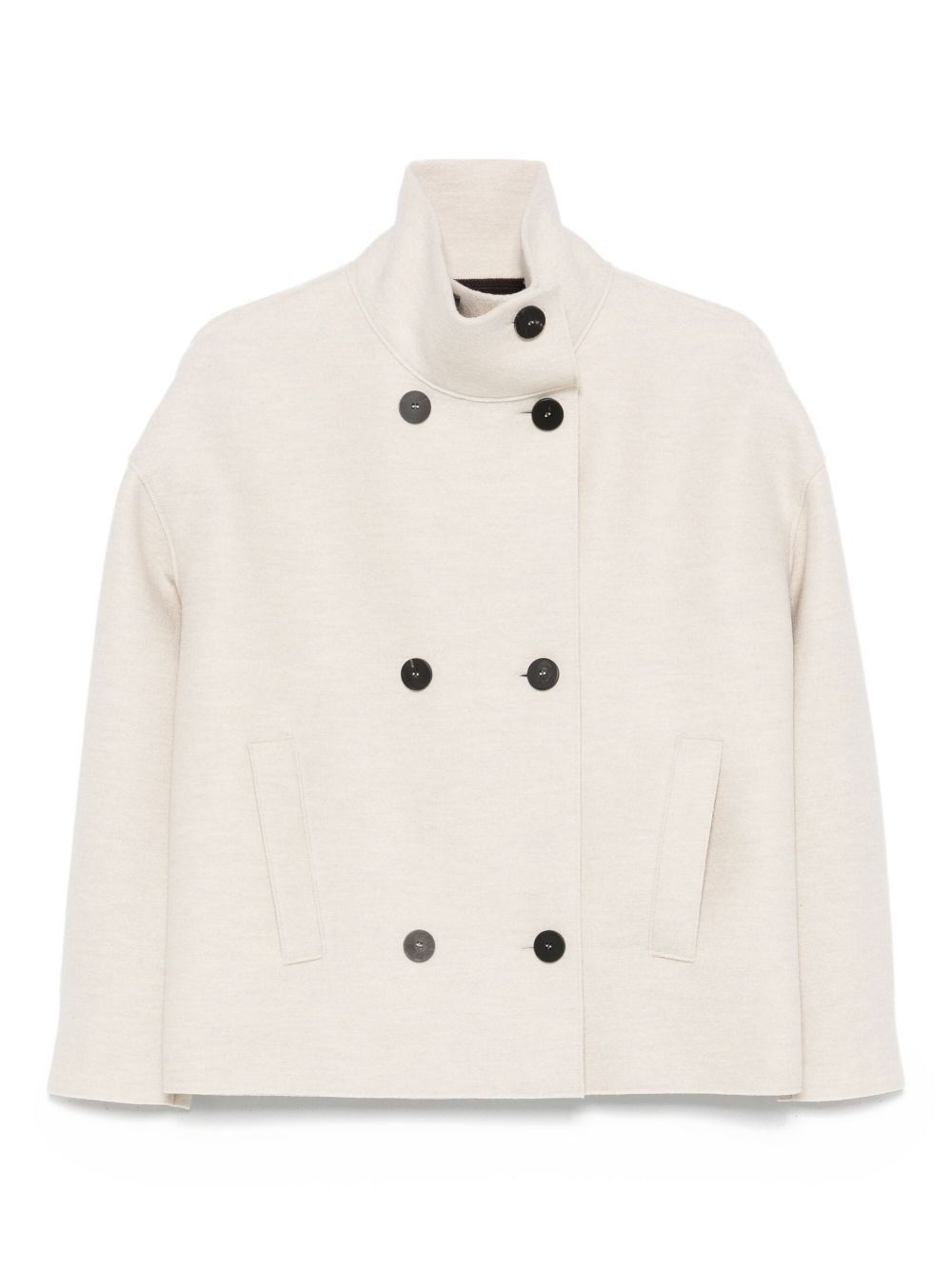 double-breasted wool jacket Highlights - Light beige - Double-breasted fastening - High neck - Long sleeves - Welt pockets Made in Italy Composition Virgin Wool 100% SIZE & FIT Model measurements Height 5 ft 9 in(1.75 m) Bust/Chest 34.64 in(88 cm) Hips 36.61 in(93 cm) Waist 26.37 in(67 cm) Washing instructions Dry Clean Only