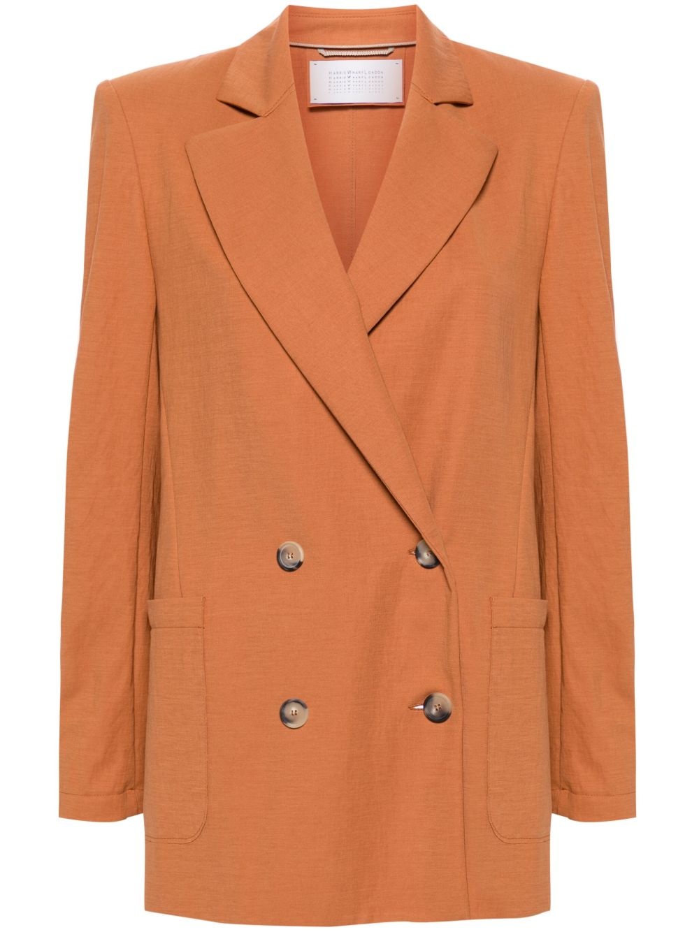 notched-lapels single-breasted blazer Highlights - Terracotta orange - Interlock twill weave - Dart detailing - Notched lapels - Double-breasted button fastening - Shoulder pads - Long sleeves - Two front patch pockets - Italian rear vents - Straight hem - Unlined Made in Italy Composition Viscose 57%, Polyamide 43% SIZE & FIT Model measurements Height 5 ft 10 in(1.77 m) Bust/Chest 33.07 in(84 cm) Hips 37 in(94 cm) Waist 24.8 in(63 cm) FittingInformation Designed for a relaxed fit, this piece allows for comfort and movement when worn The internal shoulder pads offer a structured shape Made from a midweight non-stretch fabric This piece fits true to size – take your usual size