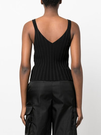Angela V-neck knitted top black ribbed knit V-neck V-back sleeveless straight hem Imported Composition Viscose 83%, Polyester 17% SIZE & FIT Model measurements Height 5 ft 11 in(1.8 m) Bust/Chest 31.49 in(80 cm) Hips 36.61 in(93 cm) Waist 24.4 in(62 cm) FittingInformation Designed for a close fit throughout Made from a midweight non-stretch fabric, this piece offers minimal elasticity when worn This piece fits true to size – take your usual size Washing instructions Dry Clean Only