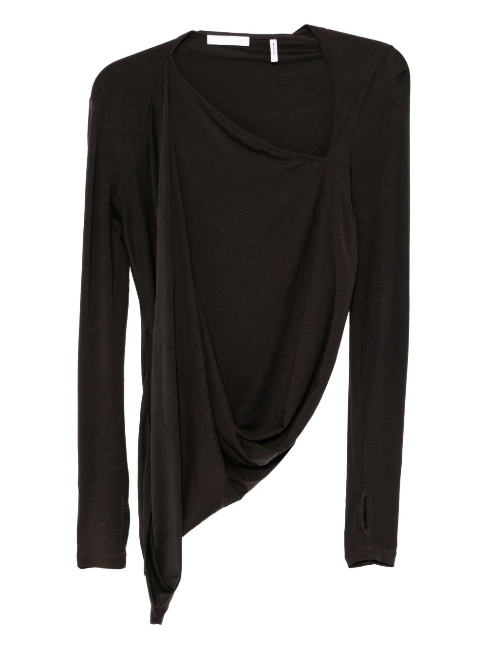 asymmetric top Highlights - Cedar brown - Long sleeves - Asymmetric hem Imported Composition Lyocell 94%, Elastane 6% SIZE & FIT Model measurements Height 5 ft 9 in(1.74 m) Bust/Chest 33.85 in(86 cm) Hips 35.03 in(89 cm) Waist 24.01 in(61 cm) FittingInformation Designed for a close fit throughout The sleeves are constructed with additional length and built-in thumb loops that allow for movement and a secure fit Made from a midweight stretch fabric, this piece offers elasticity and flexibility when worn Washing instructions Machine Wash
