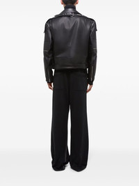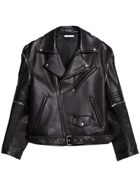 belted leather biker jacket Highlights - Black - Leather - Smooth grain - Decorative buckle detail - Ribbed detailing - Epaulettes - Silver-tone hardware - Wide notch lapels - Off-centre front zip fastening - Long sleeves - Detachable sleeves - Zip-fastening chest pocket - Two diagonal pockets to the sides - Front flap pocket - Belted waist - Straight hem Imported Composition Leather 100%